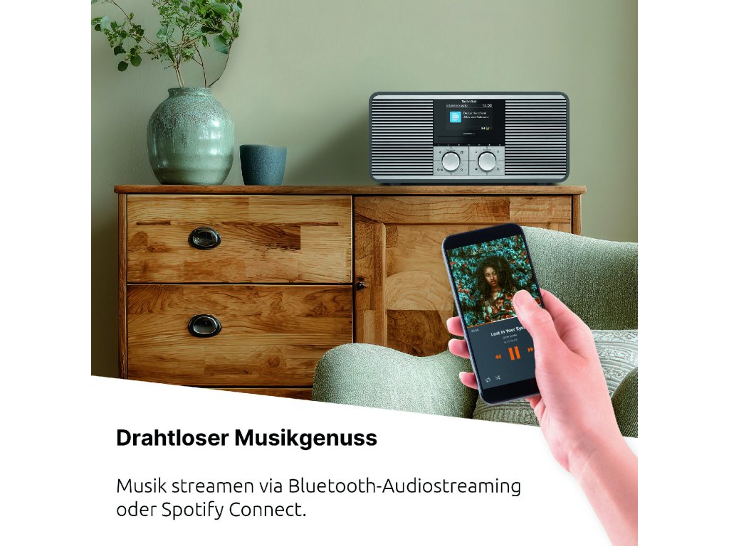 Díky dvoupásmovému Wi-Fi (2,4 a 5 GHz) pro stabilní streamy, Bluetooth 5.2, AUX-in a USB portu s funkcí nabíjení lze rádio flexibilně a pohodlně ovládat přes aplikaci, dálkové ovládání nebo přímo v zařízení.